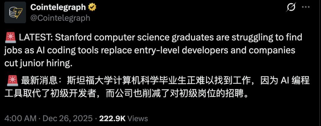 新手程序员原来那条「学编程→初级岗位→被项目毒打→变成高级工程师」的传统成长路径,似乎正在崩塌。