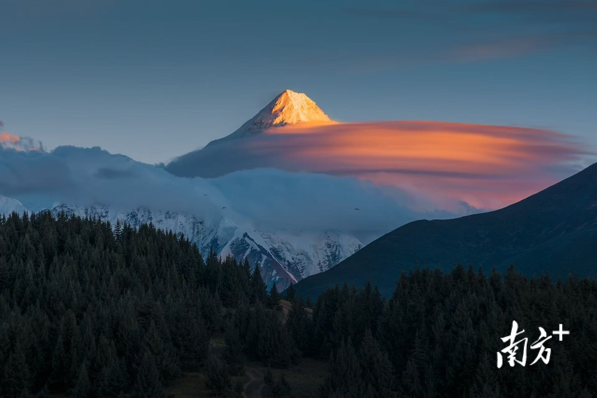 2023年11月拍于川西,日落时分,温暖的阳光点亮了 贡嘎雪山之巅以及围绕在它旁边的丝带状云。