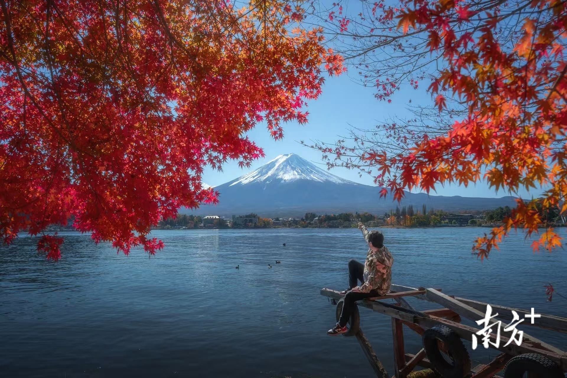 2024年11月日本富士山红叶,因为需要涉水,很少有游客会去“水中之舟”拍和富士山红叶同框。